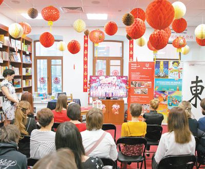 2月4日,俄羅斯首都莫斯科阿爾巴特大街上的尚斯書(shū)店里,人們?cè)谟^看春節(jié)聯(lián)歡晚會(huì)直播。新華社記者白雪騏攝俄羅斯書(shū)店里的“中國(guó)書(shū)架”。本報(bào)......