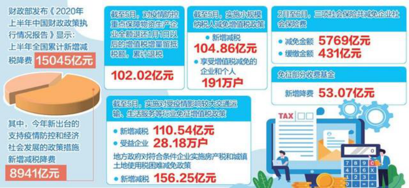 上半年,全國累計新增減稅降費15045億元。其中,今年新出臺的支持疫情防控和經(jīng)濟社會發(fā)展的政策措施新增減稅降費8941億元,2019年已出臺政策在2020年翹尾新增減稅降費6104億元。