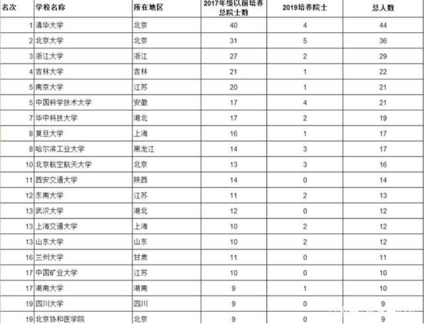 各高校的院士數(shù)量榜單如下: