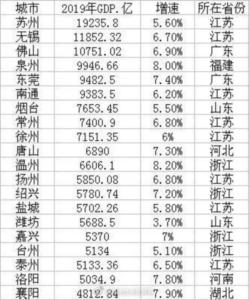 在經(jīng)濟轉(zhuǎn)型升級新階段,中心城市對區(qū)域經(jīng)濟發(fā)展的作用日益凸顯。第一財經(jīng)記者梳理了2019年普通地級市GDP20強,其中排名前19位的城市均超過了5000億元大關(guān),更有3個城市進入到GDP萬億俱樂部行列,分別是蘇州、無錫和佛山。最強的蘇州2019年GDP已達19235.8億元,將近兩萬億元,比第二名的無錫多出了7000多億元,處于遙遙領(lǐng)先的位置。