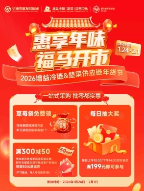 2026年1月24日,以“惠享年味·福馬開市”為主題的2026增益冷鏈&楚菜供應(yīng)鏈年貨節(jié)將在增益冷鏈(武漢)交易中心隆重啟幕?;顒訉⒊掷m(xù)至2月1日,為武漢市民打造一場集楚菜文化、傳統(tǒng)年俗與現(xiàn)代消費體驗于一體的新春盛會。